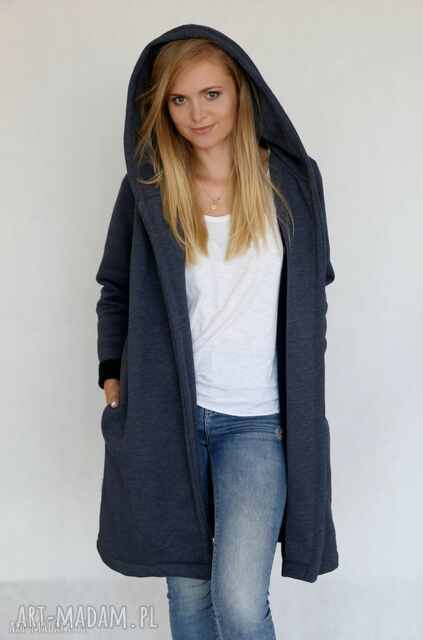 Piękny jesienny płaszcz typu oversize. Wykonany z grubej dzianiny dresowej idealnej na chłodne jesienne dni. Bardzo twarzowy i obszerny kaptur chroni przed zimnem. Można go nosić jako narzutkę lub w chłodniejsze dni przepasać paskiem, który jest dołączony do płaszcza płaszcze są polskim produktem szyte w polskiej małej pracowni.