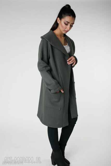 Piękny jesienny płaszcz typu oversize. Wykonany z grubej dzianiny dresowej idealnej na chłodne jesienne dni. Bardzo twarzowy i obszerny kołnierz chroni przed zimnem. Można go nosić jako narzutkę lub w chłodniejsze dni przepasać paskiem, który jest dołączony do płaszcza. Jest to polski produkt szyty w polskiej małej pracowni.